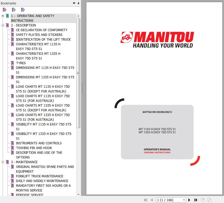 The Bookmarks of Manitou MT 1135 H EASY 75D ST5 S1 MT 1335 H EASY 75D ST5 S1 Operator's Manual: