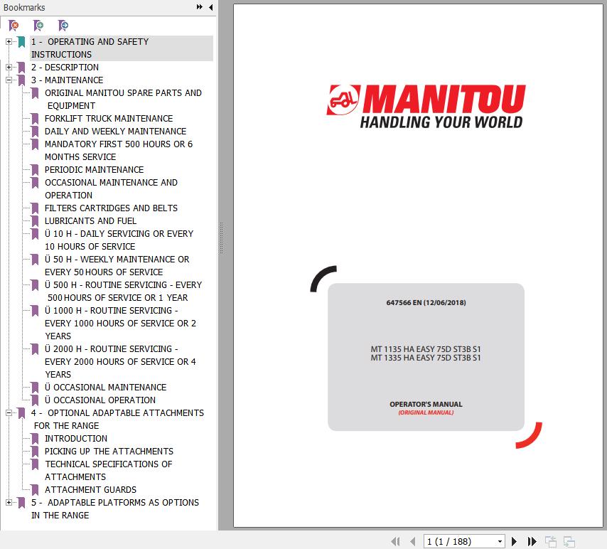 The Bookmarks of Manitou MT 1135 HA Easy 75D ST3B S1 MT 1335 HA Easy 75D ST3B S1 Operator's Manual:
