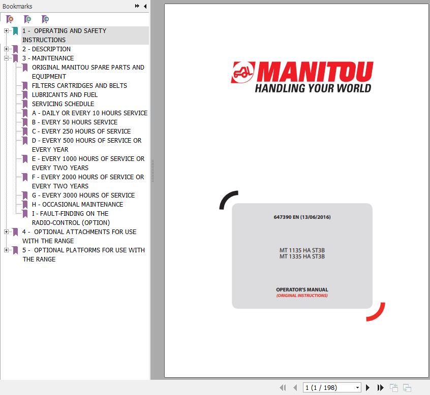 The Bookmarks of Manitou MT 1135 HA ST3B MT 1335 HA ST3B Telescopic Handlers Operator's Manual: