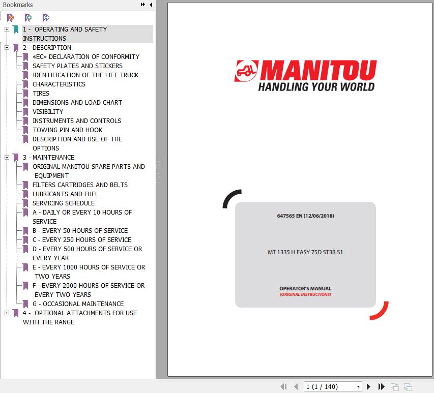 The Bookmarks of Manitou MT 1335 H EASY 75D ST3B S1 Telescopic Handlers Operator's Manual: