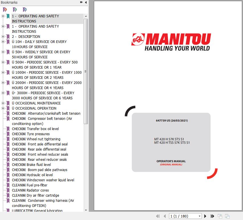 The Bookmarks of Manitou MT 420 H 57K ST5 S1 MT 420 H TSS 57K ST5 S1 Telescopic Handlers Operator's Manual:
