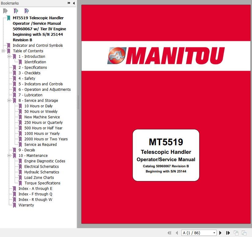 The Bookmarks of Manitou MT5519 Telescopic Handlers Operator & Service Manual:
