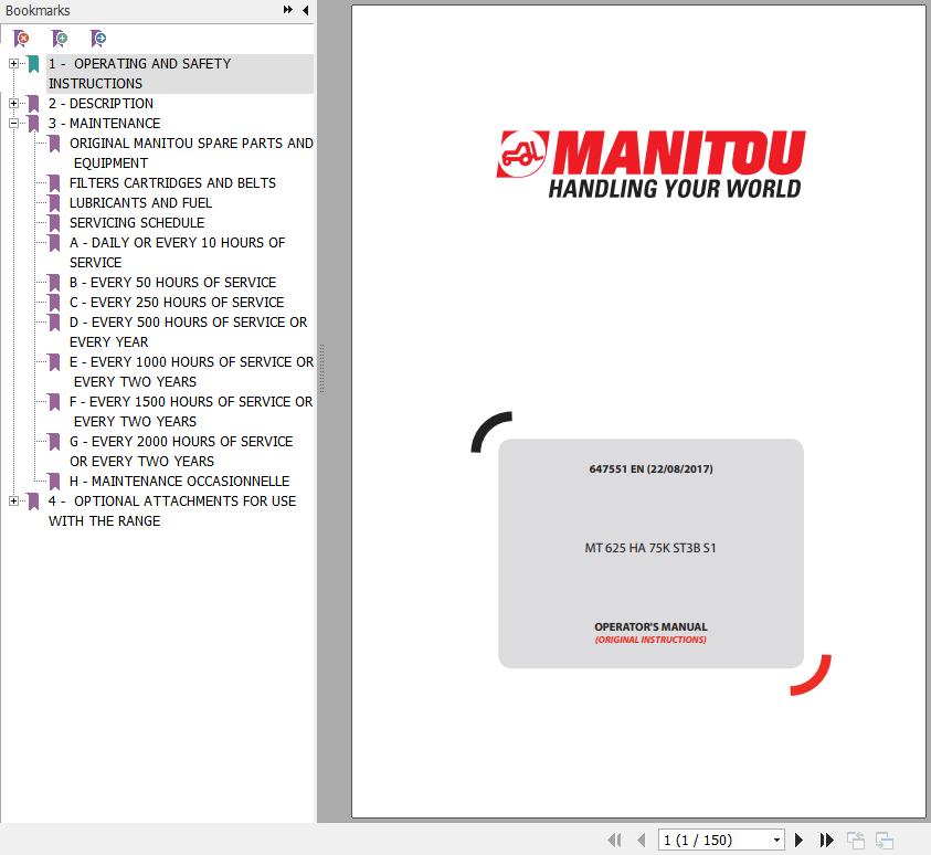 The Bookmarks of Manitou MT 625 HA 75K ST3B S1 Telescopic Handlers Operator's Manual:
