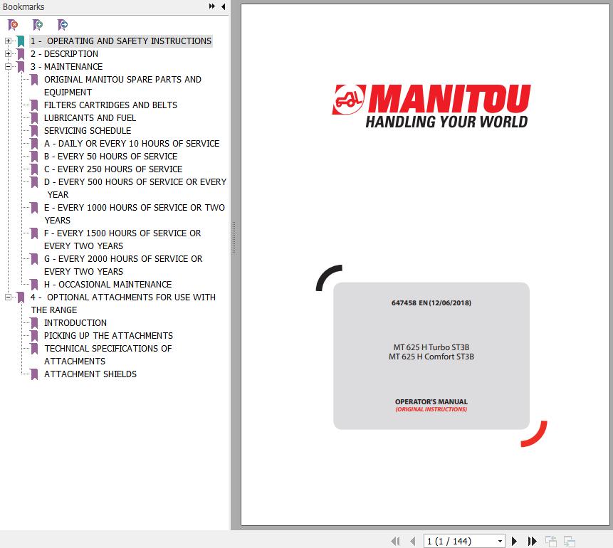 The Bookmarks of Manitou MT 625 H Turbo ST3B MT 625 H Comfort ST3B Operator's Manual: