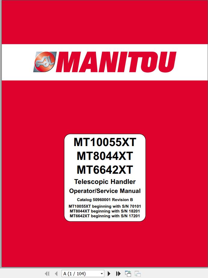 Manitou MT6642XT MT8044XT MT10055XT Operators & Service Manual 50960001 Rev.B