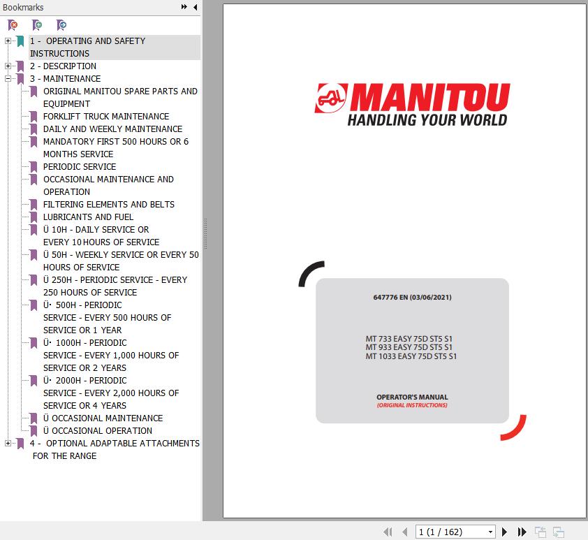 The Bookmarks of Manitou MT 733 Easy 75D ST5 S1 MT 933 Easy 75D ST5 S1 MT 1033 Easy 75D ST5 S1 Operator's Manual: