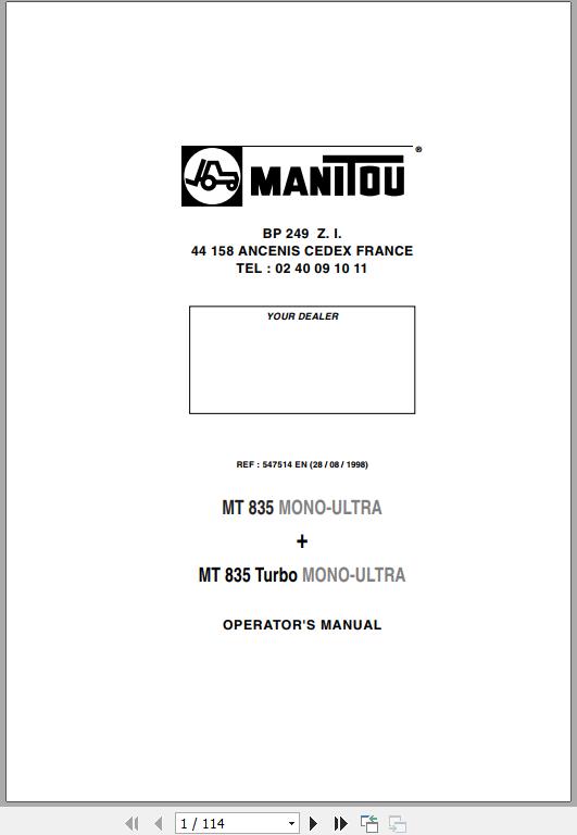Manitou MT 835 Mono-Ultra MT 835 Turbo Mono-Ultra Operator's Manual 547514 EN
