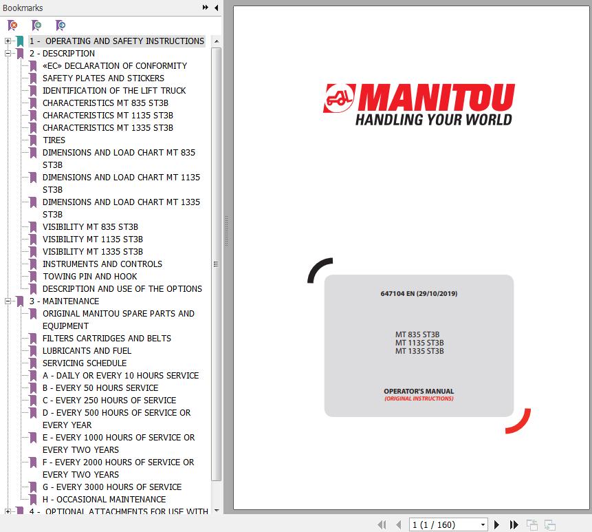 The Bookmarks of Manitou MT 835 ST3B MT 1135 ST3B MT 1335 ST3B Telescopic Handlers Operator's Manual:
