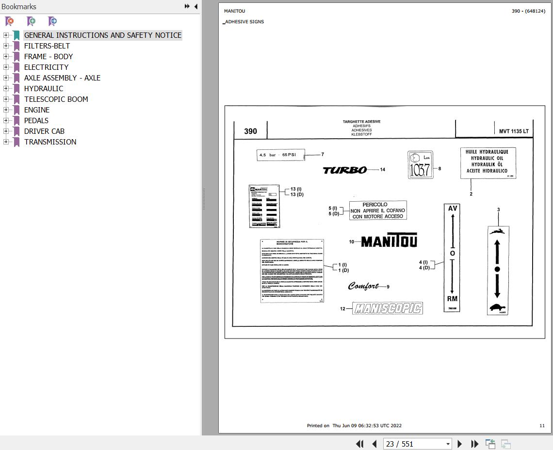 The Bookmarks Of Manitou MVT 1135 L TURBO COMFORT LINE MOT 1004 40T Telescopic Handler Parts Catalog: