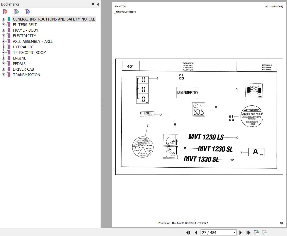 The Bookmarks Of Manitou MVT 1330 SL COMFORT LINE MOT 1004 42 Telescopic Handler Parts Catalog: