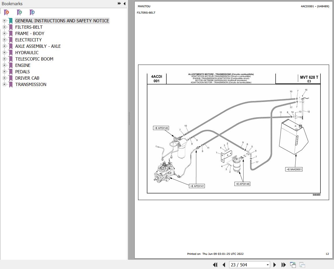 The Bookmarks Of Manitou MVT 628 TURBO MOT 1104D 44T E3 Telescopic Handler Parts Catalog: