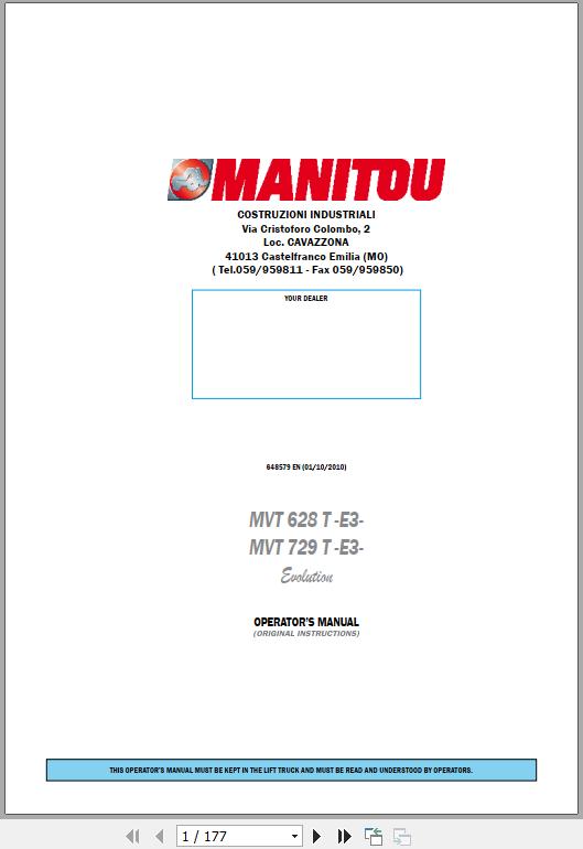 Manitou MVT 628 T E3 MVT 729 T E3 Operator's Manual 648579 EN