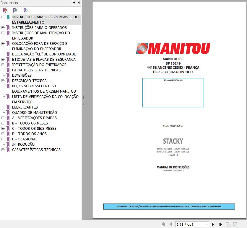 The Bookmarks of Manitou STACKY10FRS16 STACKY10FRD28 STACKY10LES16 STACKY10LED28 STACKY14 Instruction's Manual: