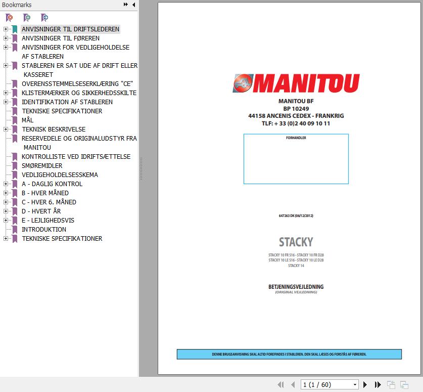 Manitou STACKY 10 FR S16 STACKY 10 FR D28 STACKY 10 LE S16 STACKY 10 LE D28 STACKY 14 Operator's Manual 647263 DK