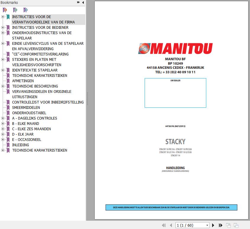 Manitou STACKY 10 FR S16 STACKY 10 FR D28 STACKY 10 LE S16 STACKY 10 LE D28 STACKY 14 Operator's Manual 647263 NL
