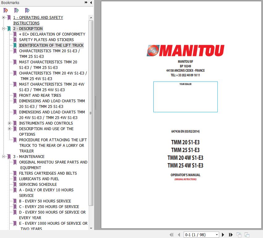 Manitou TMM 20 S1 E3 TMM 25 S1 E3 TMM 20 4W S1 E3 TMM 25 4W S1 E3 Operator's Manual 647436