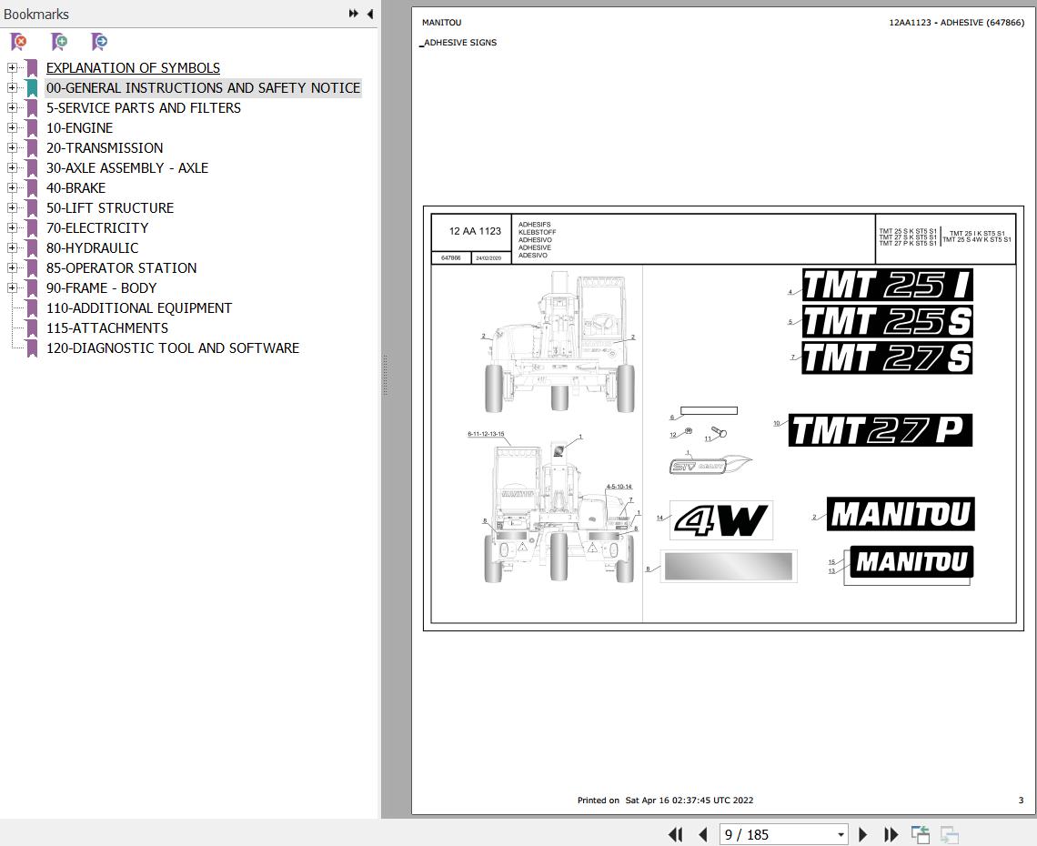 The Bookmarks Of Manitou TMT 25 I K ST5 S1 Telescopic Handler Parts Catalog: