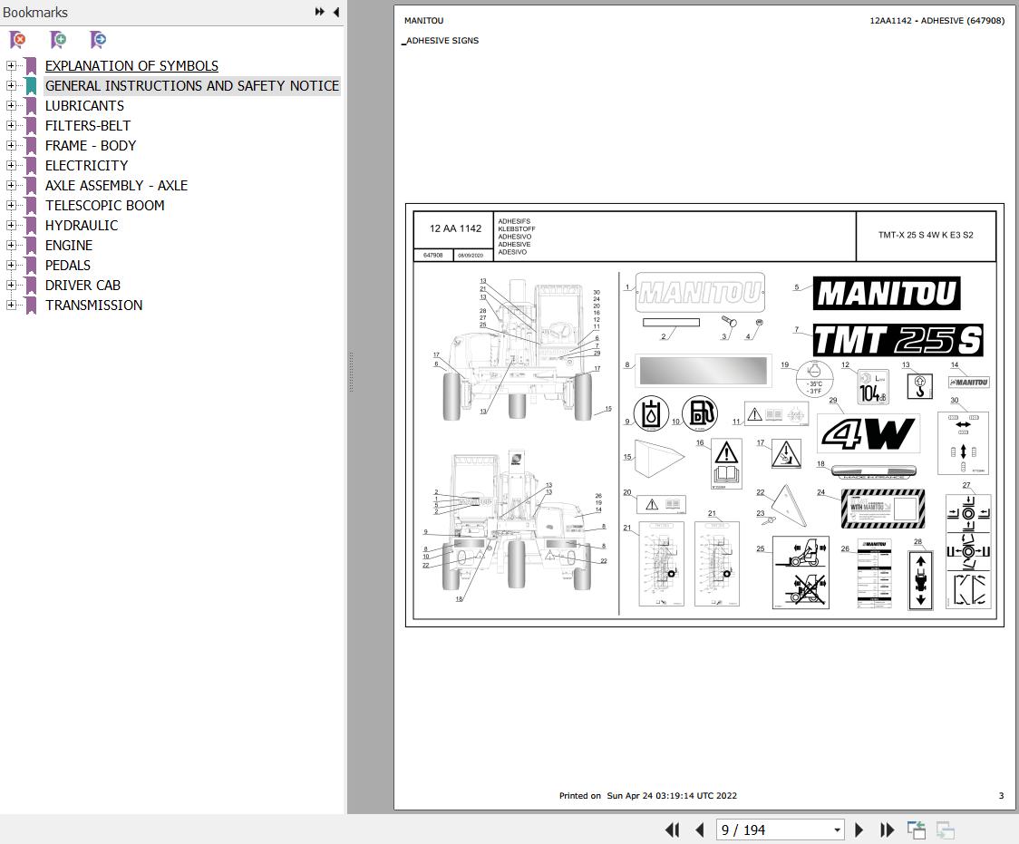 The Bookmarks Of Manitou TMT-X 25 S 4W K E3 S2 Telescopic Handler Parts Catalog: