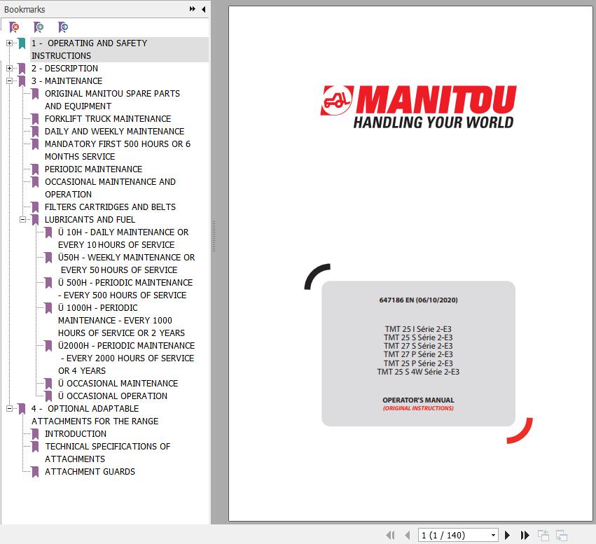 The Bookmarks of Manitou TMT 25 I Series 2-E3 To TMT 25 S 4W Series 2-E3 Operator's Manual: