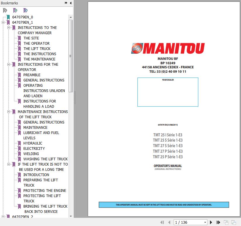The Bookmarks of Manitou TMT 25 I Series 1-E3 to TMT 25 P Series 1-E3 Operator's Manual: