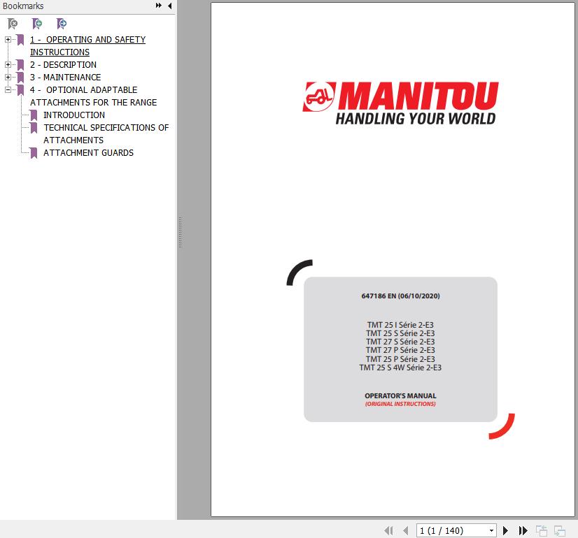 The Bookmarks of Manitou TMT 25 I Series 2-E3 to TMT 25 S 4W Series 2-E3 Operator's Manual: