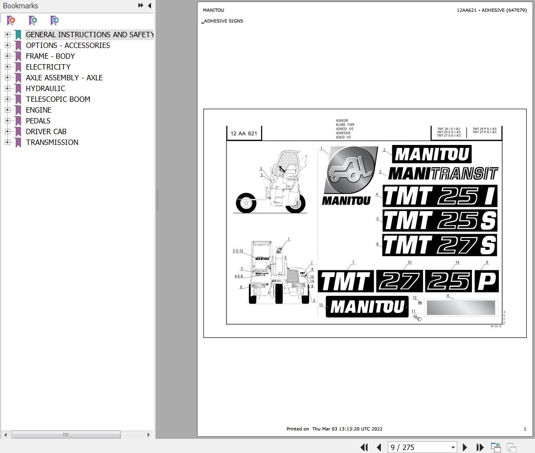 The Bookmarks Of Manitou TMT25IS1E3 Truck Mounted Telehandler Parts Catalog: