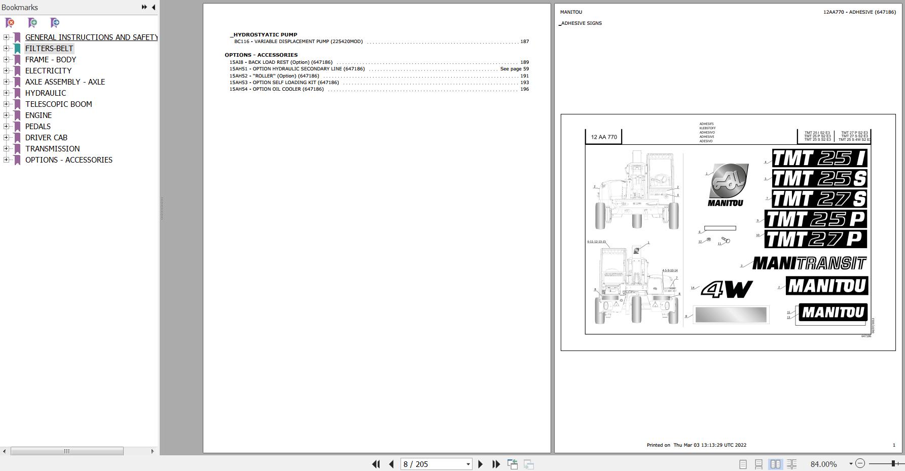 The Bookmarks Of Manitou TMT25SS2E3 Truck Mounted Telehandler Parts Catalog: