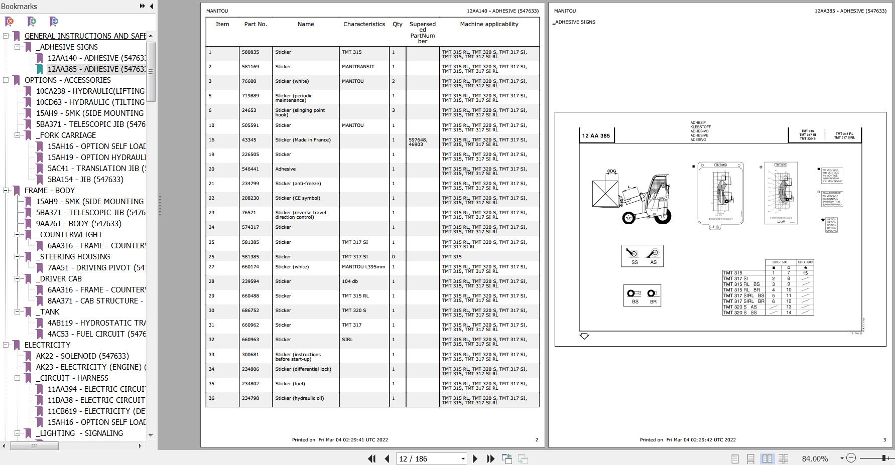 The Bookmarks Of Manitou TMT317 SIRL Truck Mounted Telehandler Parts Catalog: