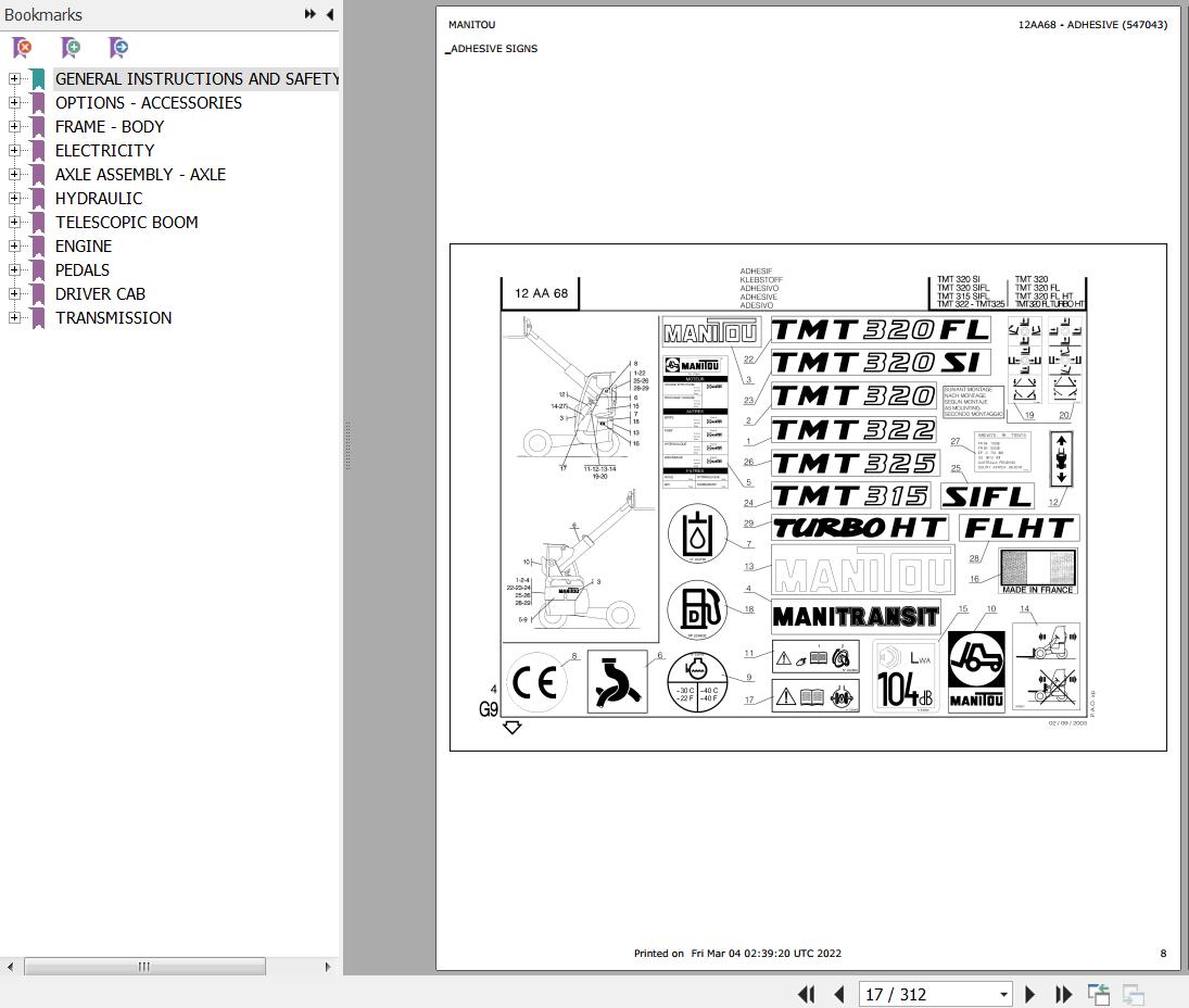The Bookmarks Of Manitou TMT320 Truck Mounted Telehandler Parts Catalog: