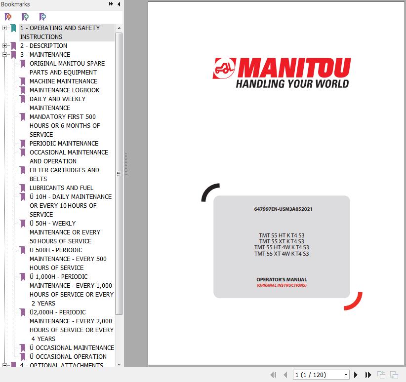The Bookmarks of Manitou TMT 55 HT K T4 S3 to TMT 55 XT 4W K T4 S3 Operator's Manual: