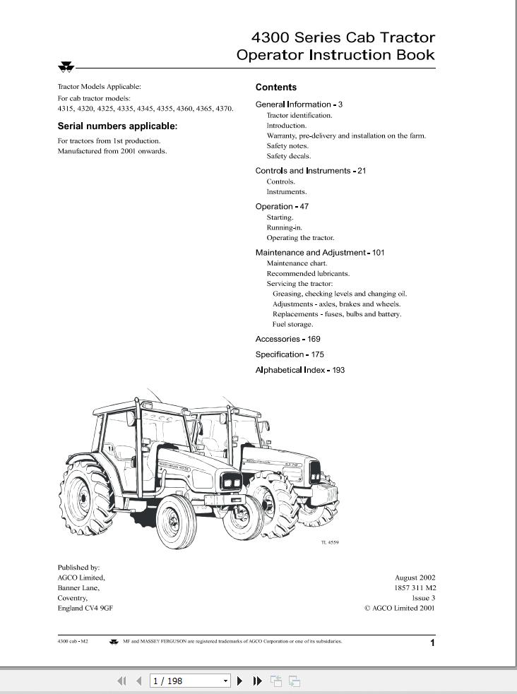 Massey Ferguson 4315 to 4370 Operators Manual 1857311M2