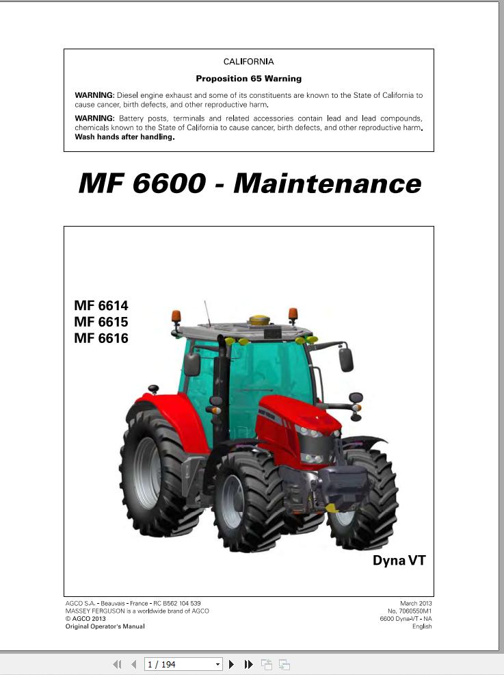 Massey Ferguson 6614 6615 6616 Dyna-VT Maintenance Manual 7060550M1