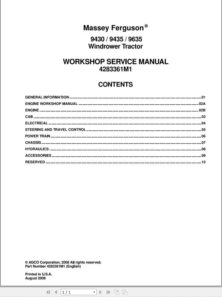 Massey Ferguson 9430 9435 9635 Workshop Service Manual 4283361M1