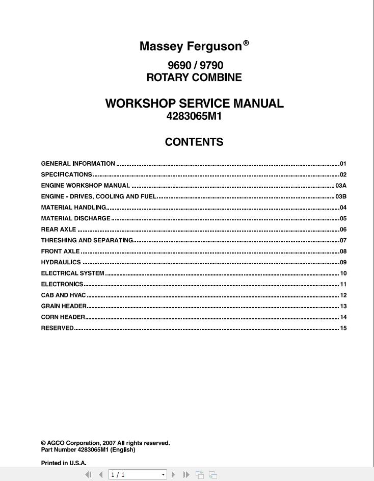 Massey Ferguson 9690 9790 Workshop Service Manual 4283065M1
