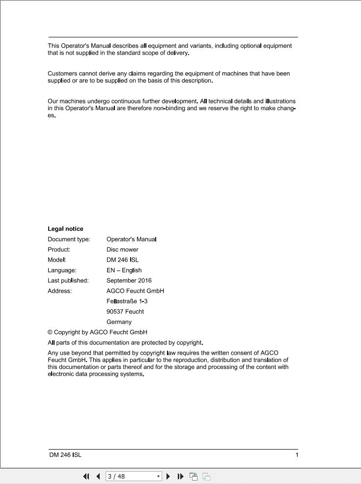 Massey Ferguson DM246ISL Operators Manual FEL1376440101