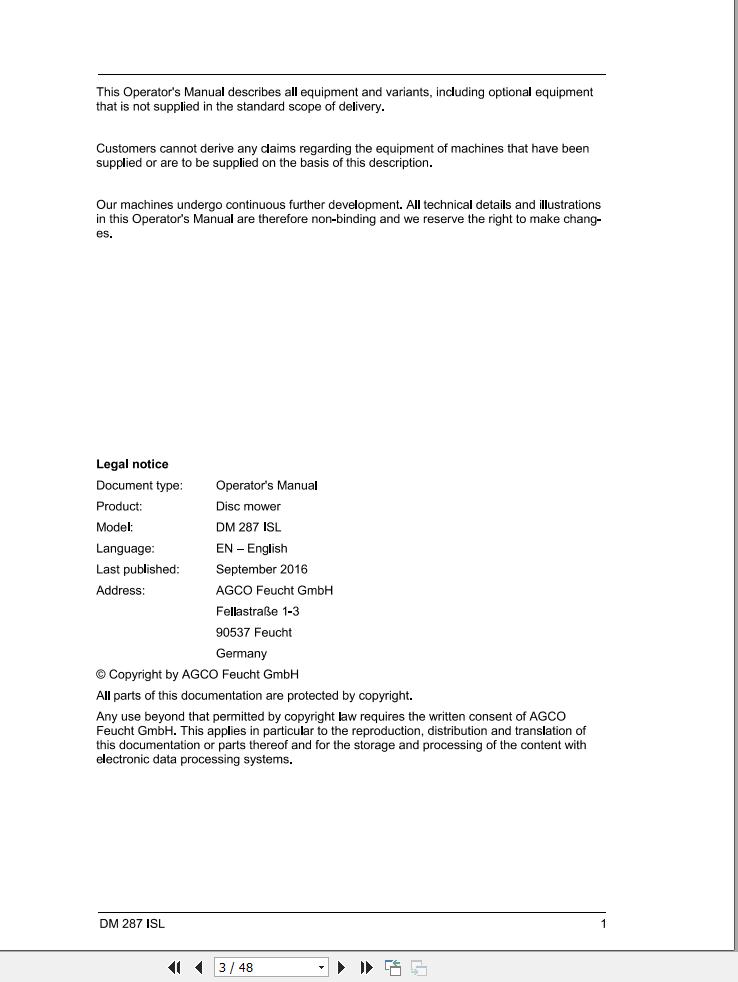 Massey Ferguson DM287ISL Operators Manual FEL1376380101