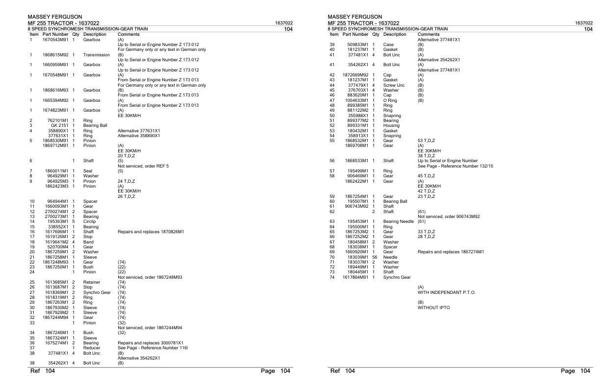 Massey Ferguson MF 255 Parts Catalog 1637022