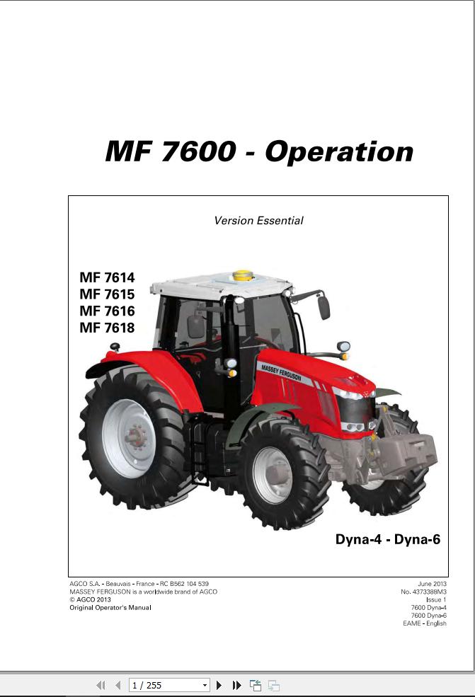 Massey Ferguson MF7614 MF7615 MF7616 MF7618 Operators Manual 4373388M3