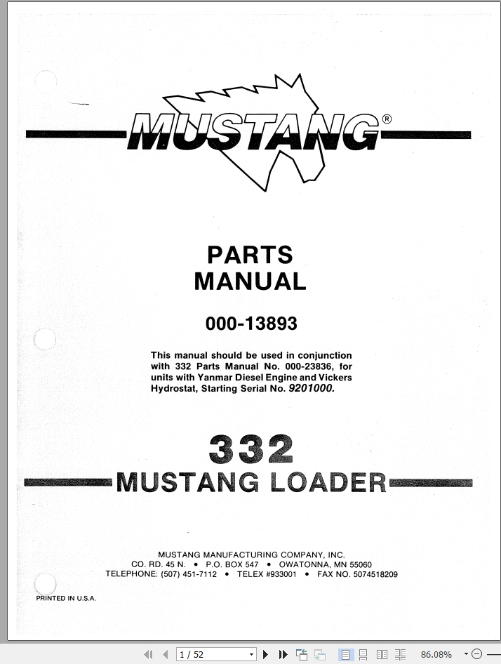 Mustang 332 Parts Manual 000-13893BSize: 5.7 MBMachine: Skid-Steer LoaderMachine Model: 332Page: 52 PagesPart Number: 000-13893B