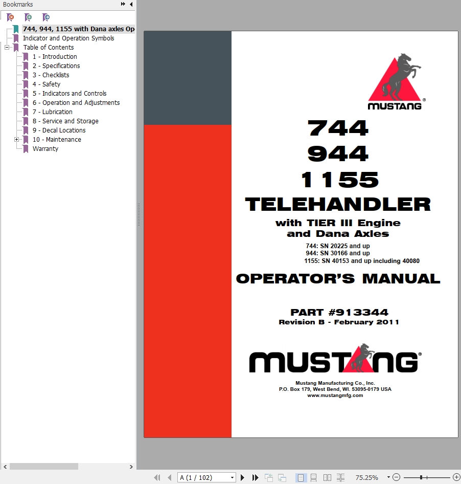 The Bookmarks of Mustang 744 944 1155 Telehandler Operator's Manual: