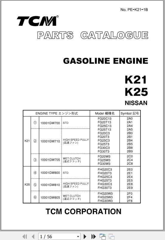 Nissan Engine K21 K25 For TCM FG20C13 To FHG30W3 Parts Catalog PE-K21-1B