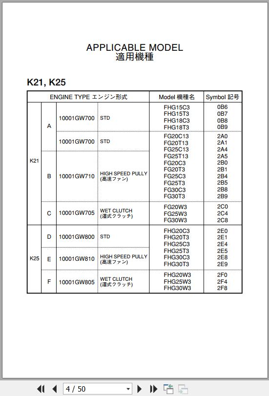 Nissan Engine K21 K25 For TCM FHG15C3 To FHG30W3 Parts Catalog PE-K21-1C