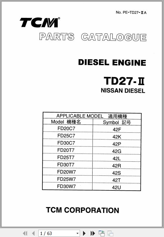 Nissan Engine TD27-II For TCM FD20C7 To FD30W7 Parts Catalog PE-TD27-IIA