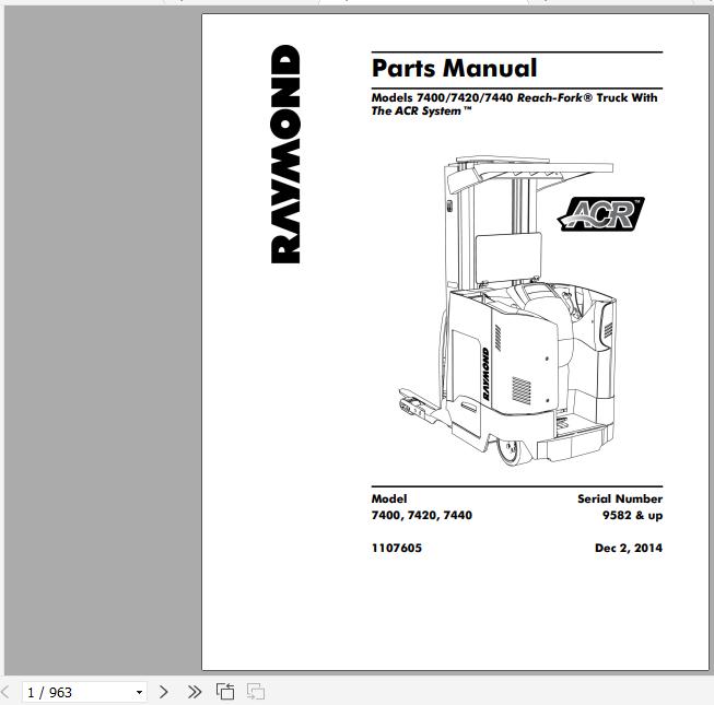 Raymond 7400 7420 7440 Parts Manual SN 09582 and Up 2014 1107605