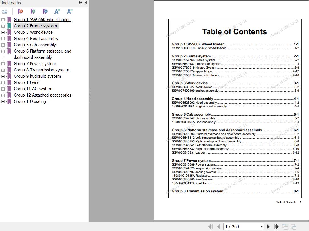 The Bookmarks of Sany SW966K Parts Book SSW100000019: