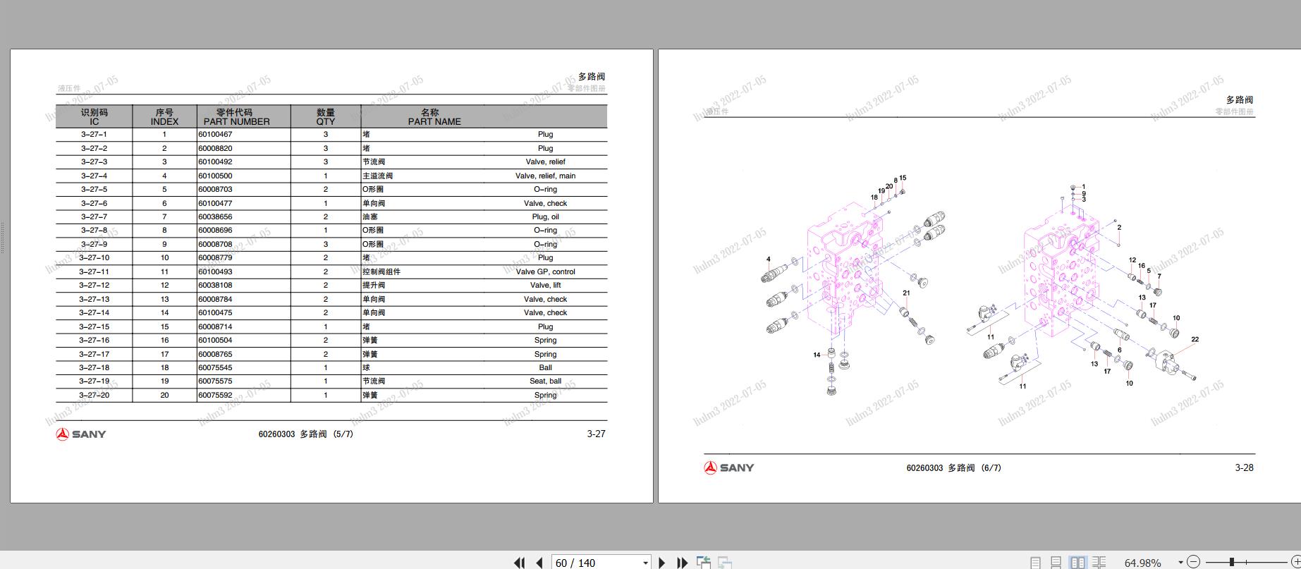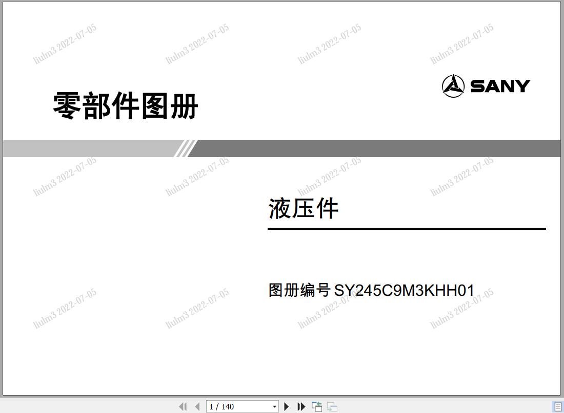 Sany SY245C9 Hydraulic Parts Manual SY245C9M3KHH01