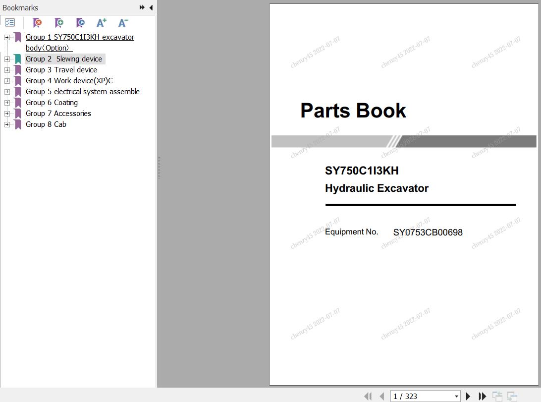The Bookmarks of Sany SY750C1I3KH Parts Book SY0753CB00698: