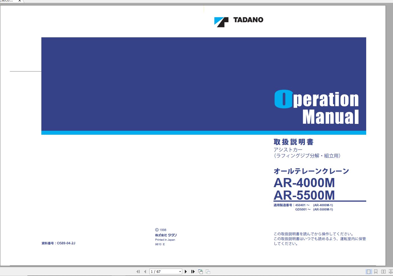 Tadano AR-4000M-1 AR-5500M-1 Operation Manual O589-04-2J