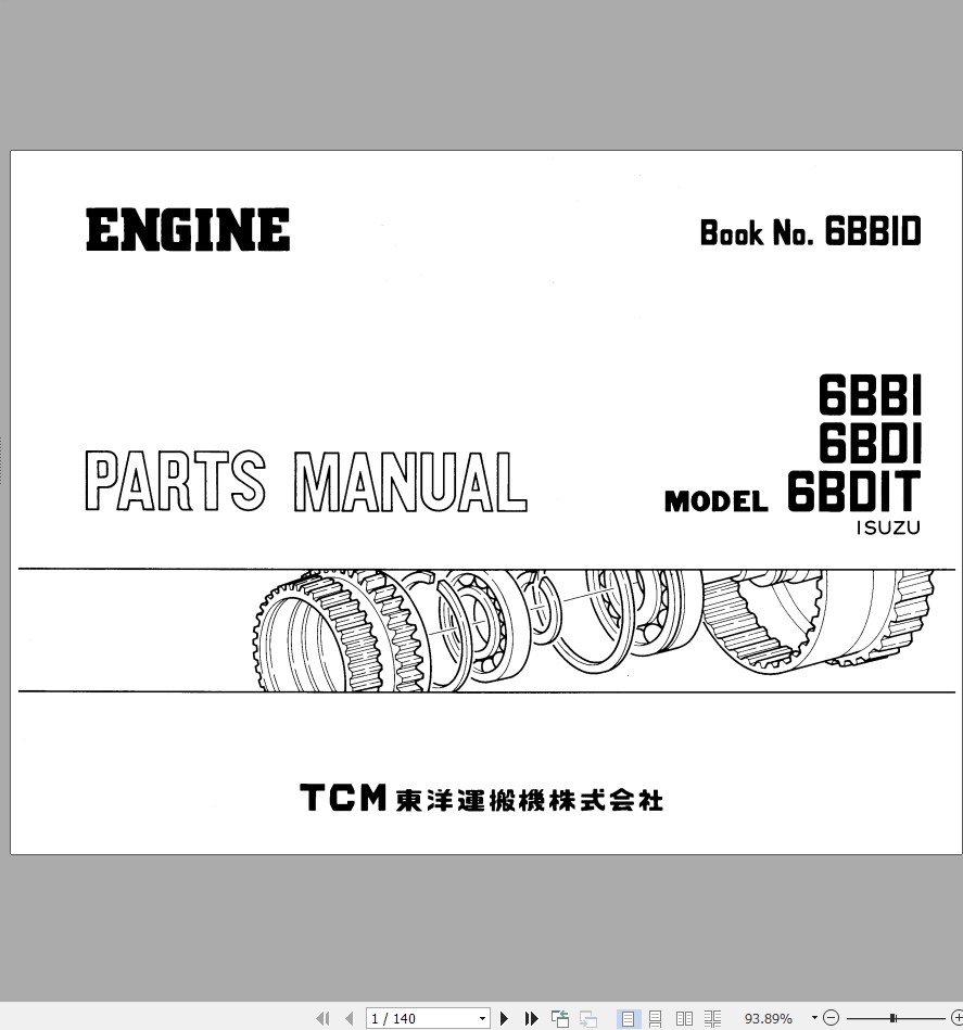 TCM 6BBI 6BDI 6BDIT Isuzu Parts Manual 6BB1DSize: 5.1 MBMachine: EngineMachine Model: 6BBI 6BDI 6BDITPage: 140 PagesBook No: 6BB1D