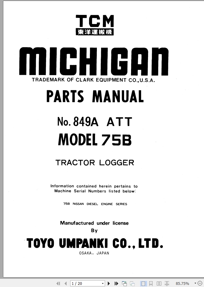 TCM 75B Parts Manual 849A ATTSize: 0.4 MBMachine: Tractor LoggerMachine Model: 75BPage: 20 PagesBook No: 849A ATT